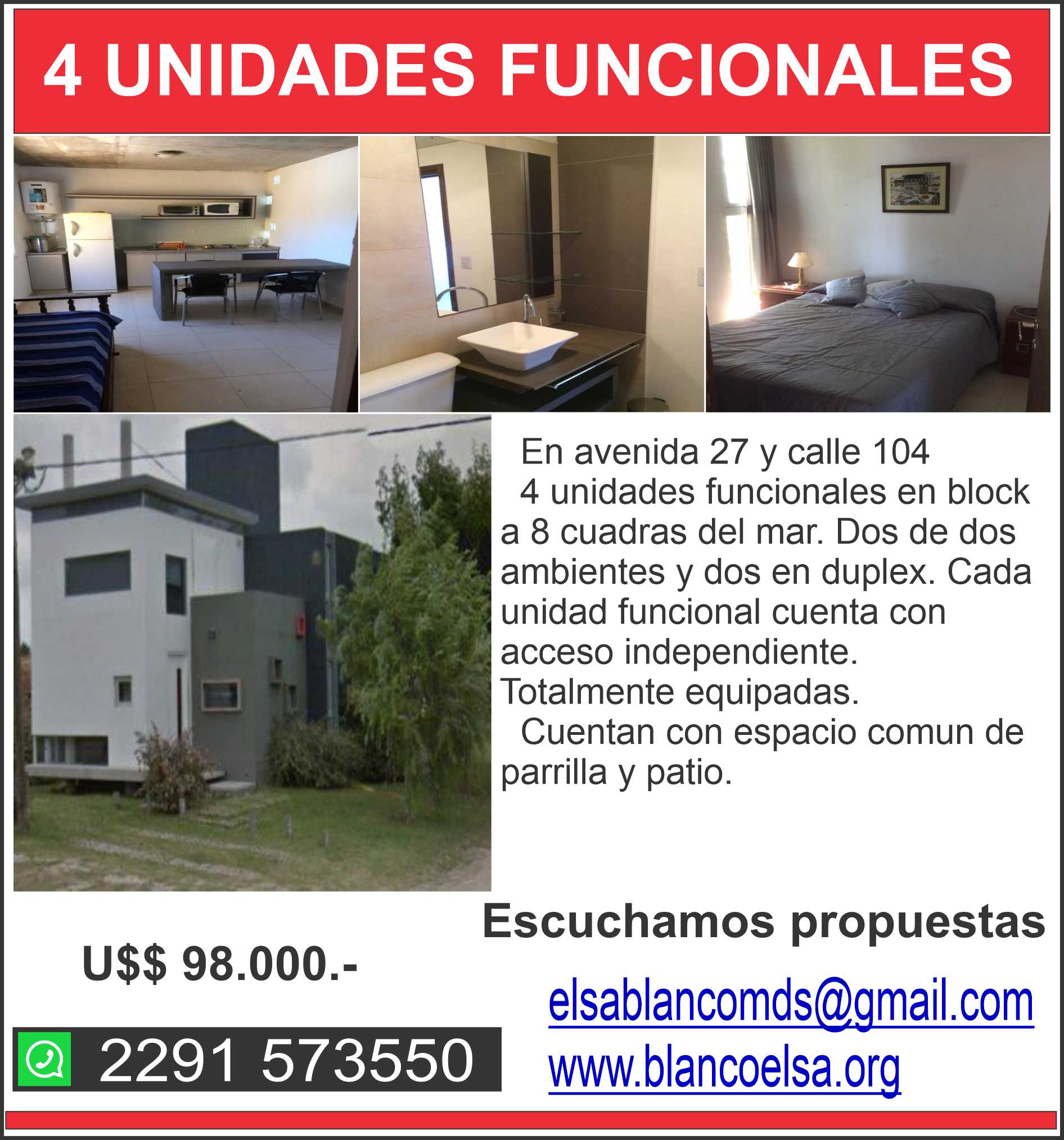 OPORTUNIDAD EN MAR DEL SUD A 8 CUADRAS DEL MAR !!!. 4 dptos. en block . dos de dos ambientes y dos en modalidad dúplex. Tres de ellos totalmente equipados con posibilidad de alquiler. Cuentan con espacio común de parrilla , patio y salidas totalmente independiente a la calle. Dispuestos sobre asfalto en ruta de acceso a Mar Del Sur. ESCUCHAMOS TU PROPUESTA , NO DUDES EN CONTACTARNOS. #CS 28.