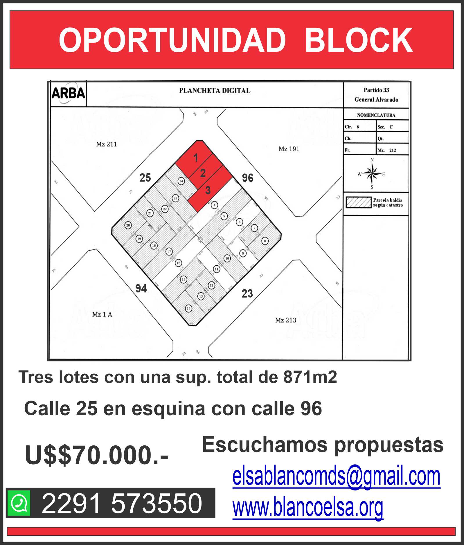 EXCELENTE BLOCK DE TERRENO A LA VENTA EN ZONA CENTRO DE MAR DEL SUD. En esquina de calle 25 y 96 se ofrecen 871m2. Listos para escritura y con impuestos al día. #LT60
