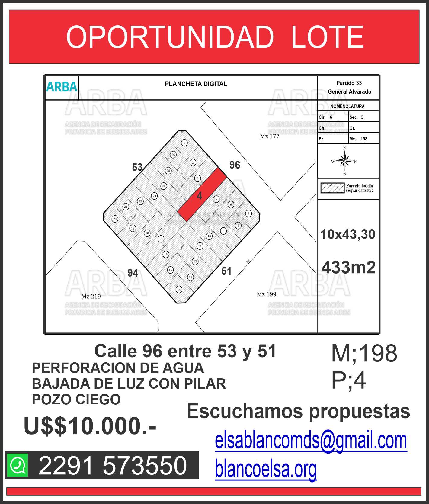 EN MAR DEL SUD EXCELENTE LOTE CON MEJORAS. Se ofrece a la venta lote de 10mts x 43,30mts. El lote posee perforación para el agua, pozo ciego y bajada de luz con pilar. El lote posee una pequeña construcción que no es tomada por la valoración. EXCELENTE OPORTUNIDAD DE INVERSION. ESCUCHAMOS TU PROPUESTA. #LT65