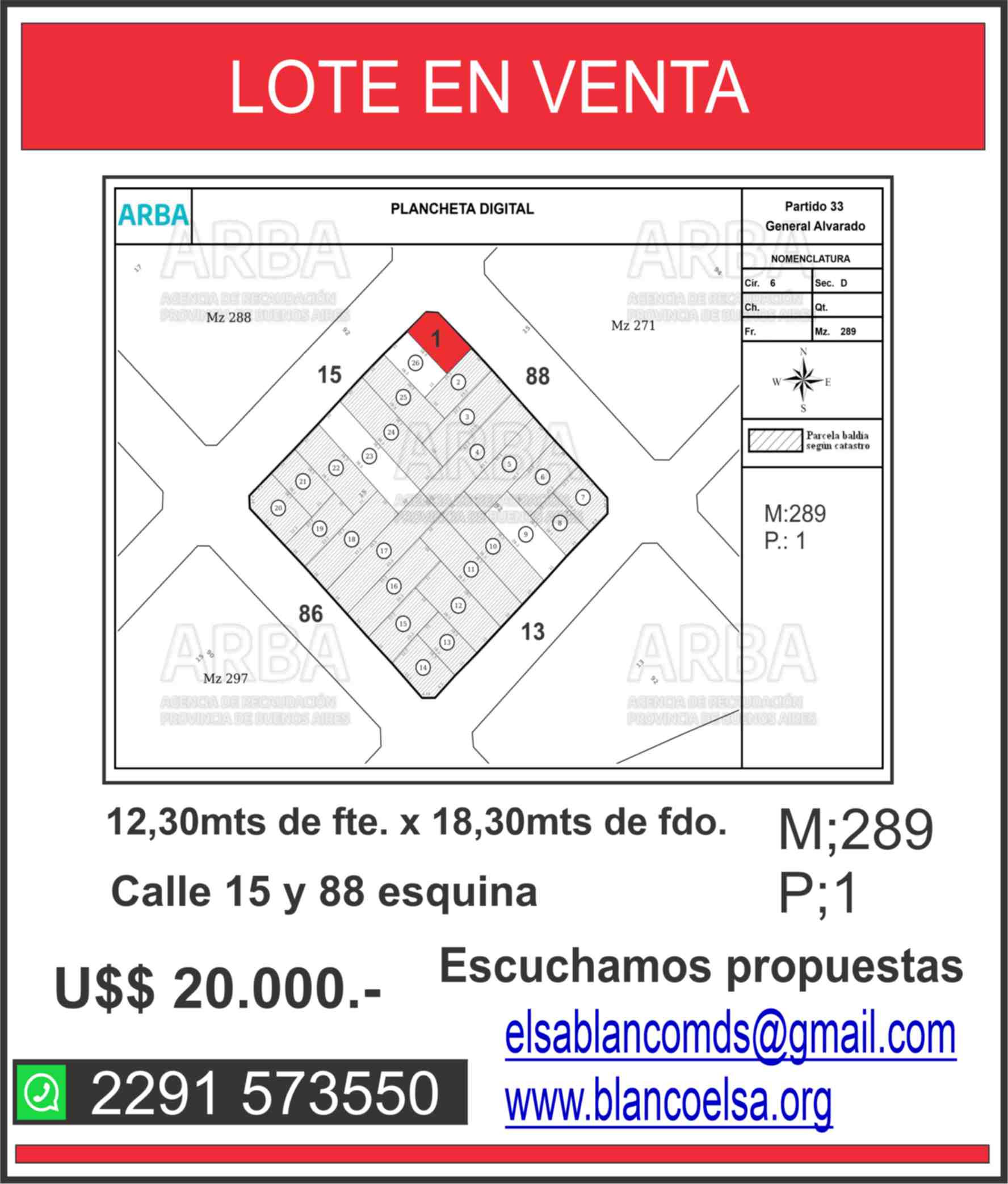 LOTE DE TERRENO CON EXCELENTE UBICACION A 150 METROS DE LA PLAYA !!!. 220 m2 en la esquina de calle 15 y 88. #LT23