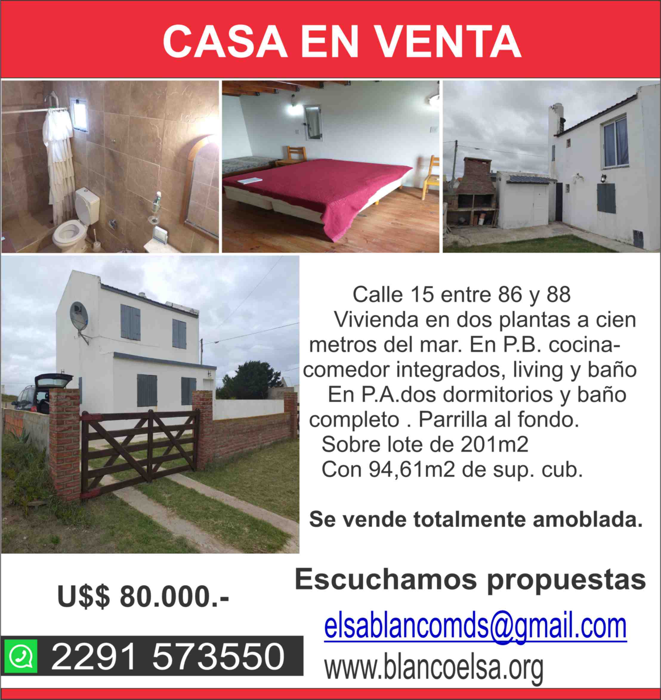CASA EN MAR DEL SUD A CIEN METROS DE LA PLAYA!!!. En P.B. cocina comedor integrados, living y baño completo. En P.A. , dos dormitorios , un baño completo. Jardín al frente, patio al fondo con parrilla y cuarto para guardado de accesorios. Se vende amoblada, detalles a terminar de electricidad.. TOMAMOS Y CONSIDERAMOS TU OFERTA EN VALOR Y FORMA DE PAGO. !!! #CS13