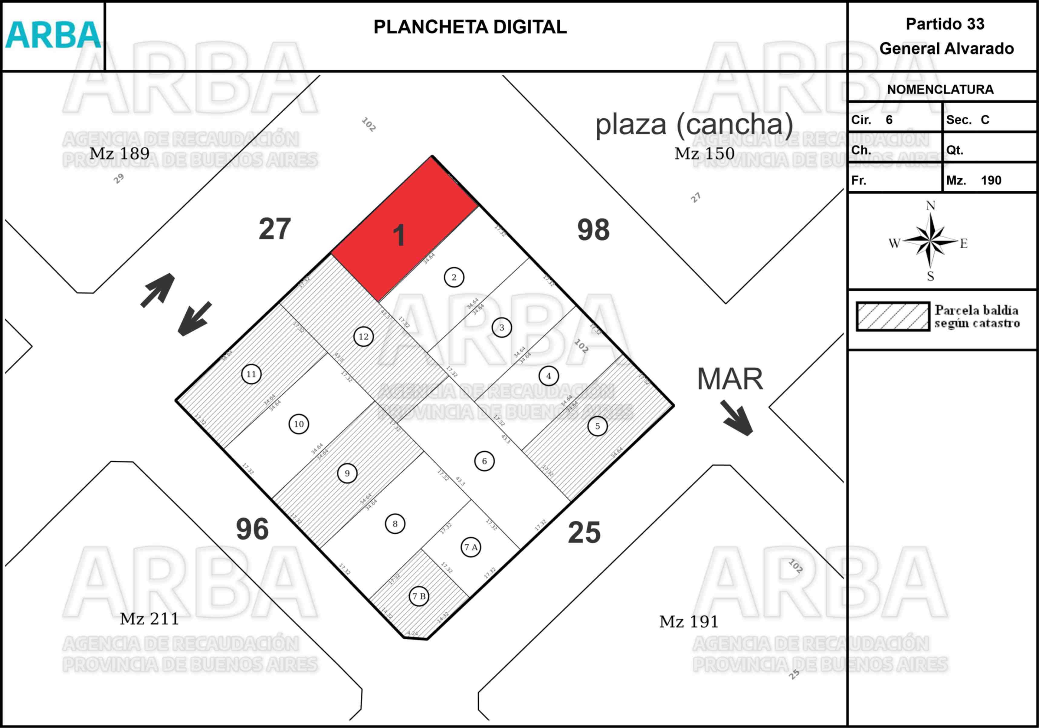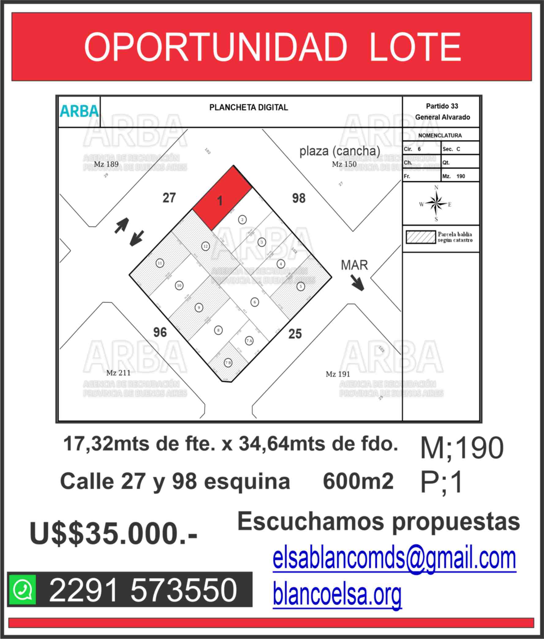EXCELENTE OPORTUNIDAD EN EL CENTRO DE MAR DEL SUD!!!. Lote de terreno frente a una de las plazas, hoy utilizadas como cancha de futbol. Excelente esquina de 600m2. Calle 27(ruta) y calle 98. #LT27.