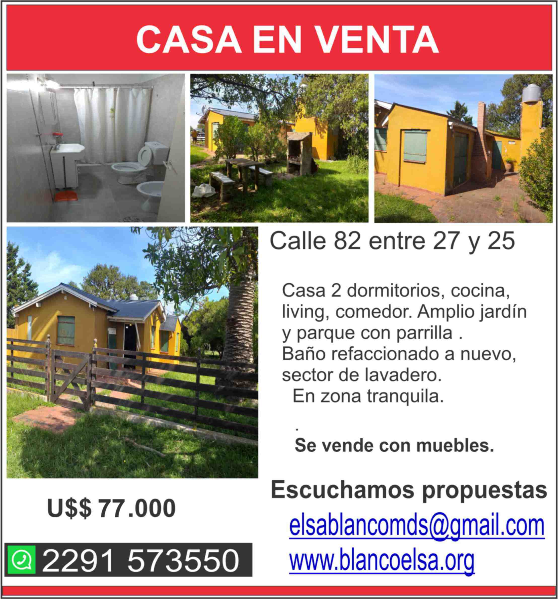 CASA EN VENTA EN MAR DEL SUD!!! Linda casa en zona tranquila de Rocas Negras, Dos dormitorios , living , cocina. Un baño remodelado a nuevo. amplio espacio de jardín al frente y parque con parrilla al fondo a 600mts del mar. #CS14
