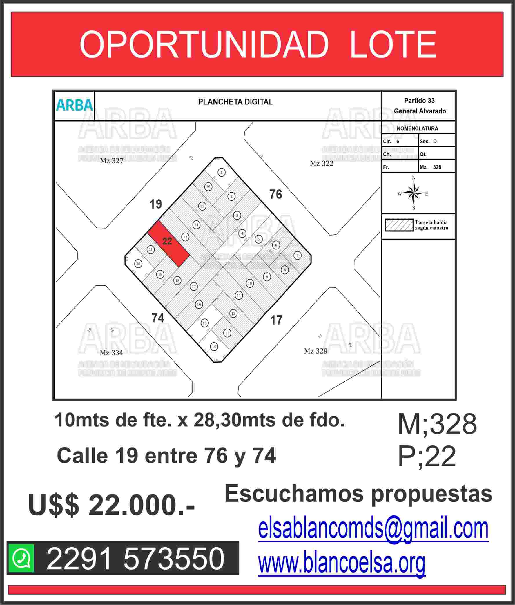EXCELENTE LOTE EN MAR DEL SUR A 200MTS DEL MAR!!!. Sobre calle 19 de 10x 28,30 y escuchamos tu propuesta.#LT36