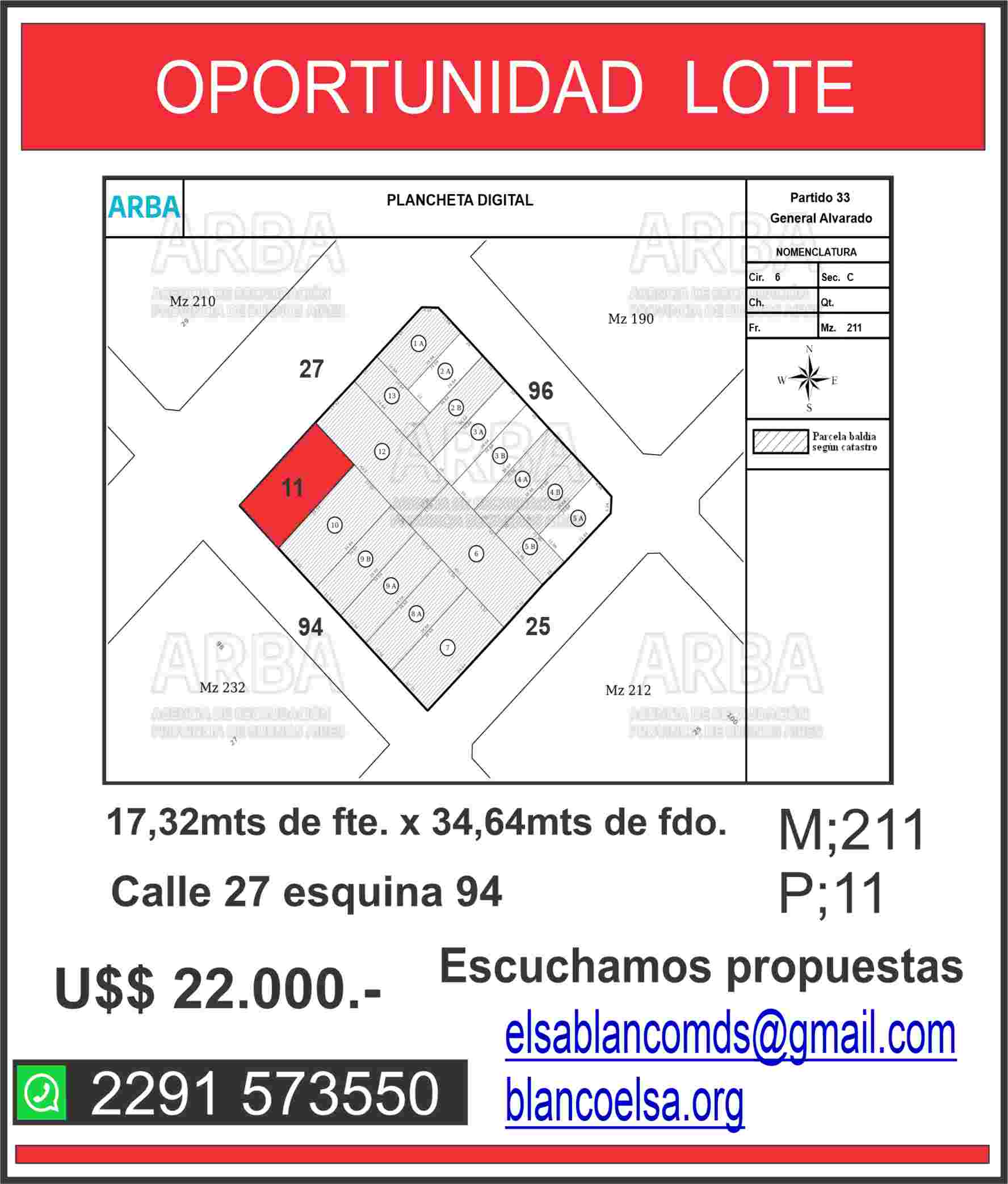 EXCELENTE LOTE A LA VENTA A 200MTS DE PLAZA CENTRAL DE MAR DEL SUD SOBRE AV 27. Lote en esquina de 600m2 .#LT41