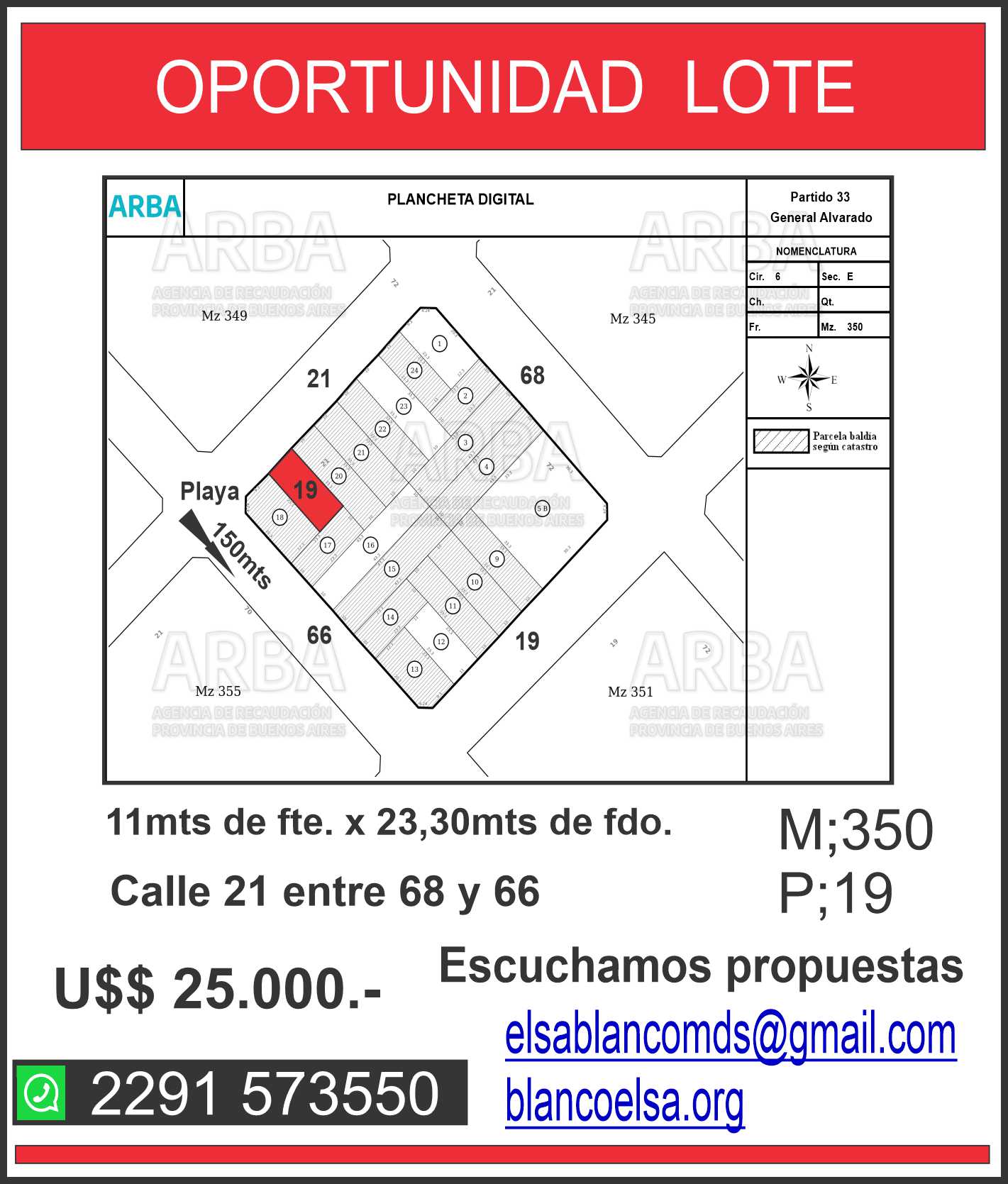 LOTE EN MAR DEL SUR A 150 METROS DEL MAR!!! . Excelente lote de 11mts de frente por 23,30 metros de fondo, ubicado en el barrio de Rocas Negras. Zona en permanente crecimiento. ESCUCHAMOS TU PROPUESTA!!!. #LT 45